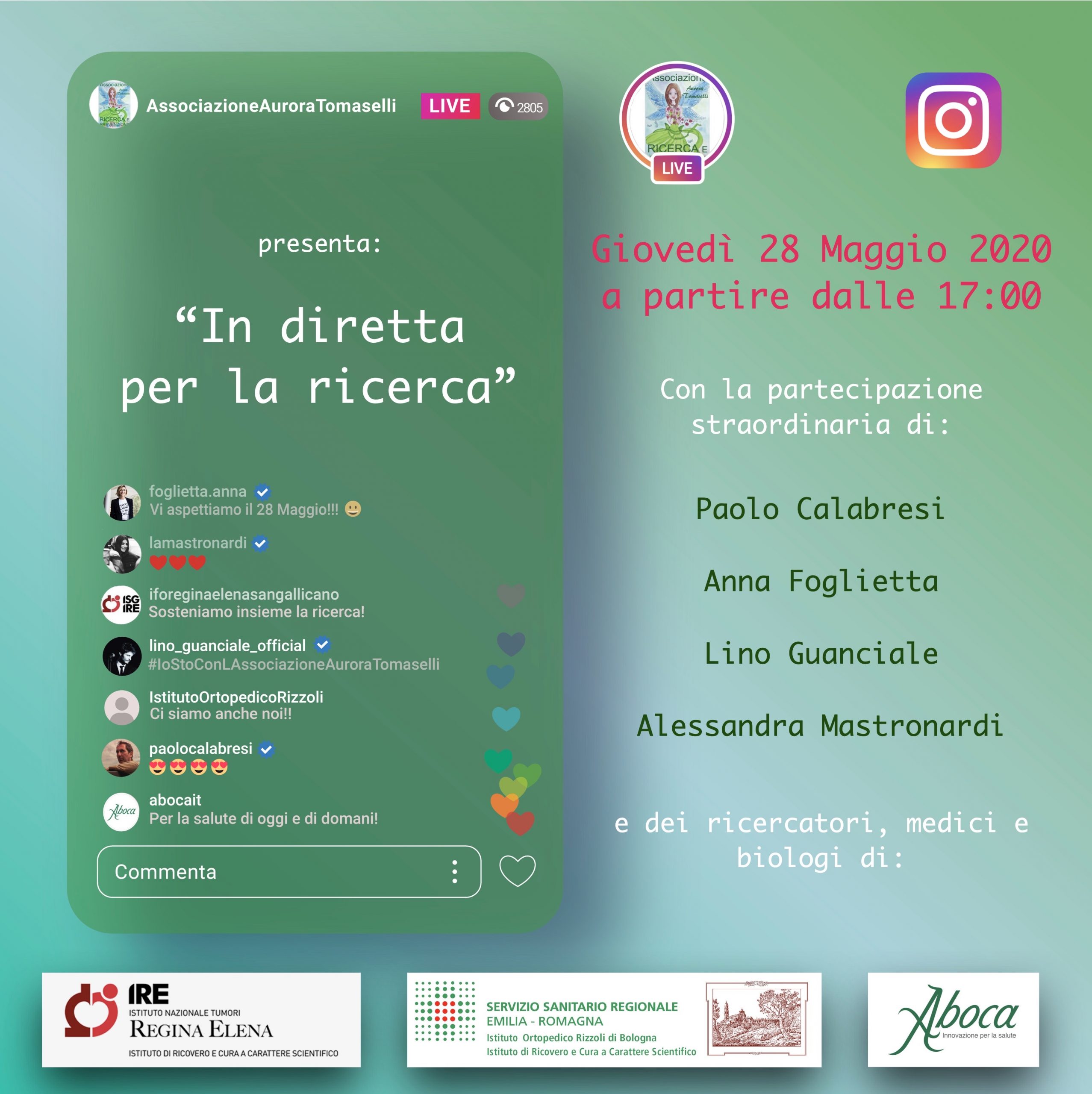 ll 28 Maggio a partire dalle 17 saremo in diretta Instagram per celebrare i dieci anni dalla fondazione della nostra associazione e per parlare di ricerca sul cancro. Interverranno: Giovanni Blandino (Responsabile del laboratorio di Oncogenomica Traslazionale Istituto Nazionale Tumori Regina Elena di Roma), Alessandra Longhi (Responsabile f.f. Chemioterapia tumori dell’apparato locomotore Istituto Ortopedico Rizzoli di Bologna), Massimo Serra (Dirigente Biologo Laboratorio di Oncologia Sperimentale Istituto Ortopedico Rizzoli di Bologna) e Valentino Mercati (presidente e fondatore del gruppo Aboca, azienda italiana leader in Europa della ricerca scientifica e della produzione di dispositivi terapeutici a base di complessi molecolari vegetali).